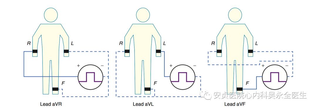 上面这两张图描述的就是标准导联与加压肢体导联,即I、II、III、avF、avL、avR。大家都知道,3个位置中的任意两点就能形成一个环路,不同的组合就会形成不同的波形。