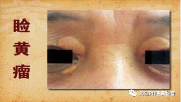 敲黑板,敲黑板!重点来了!睑黄瘤是常见的黄色瘤的一种,是真皮内因含有脂质的组织细胞积聚而形成的黄色的皮肤丘疹或结节。因此属脂质代谢障碍疾病,常伴有高脂血症和高胆固醇血症。多发生在眼睑上,呈对称分布的黄色或橙色斑块,初起如米粒大,微微高出皮肤,与正常皮肤截然分开,边界不规则,甚至可布满整个眼睑。